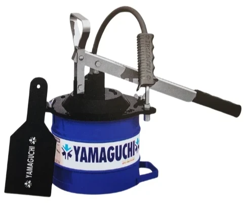 Bomba manual para grasa de alta presión con balde hecho en chapa de acero, tapa en aluminio inyectado, válvula de bola en acero, filtro (patentado en Brasil), resorte de alta compresión, disco rascador, manguera con trama de acero de alta presión, mango, extensión rigida, acoplador y espátula de grasa exclusiva.
